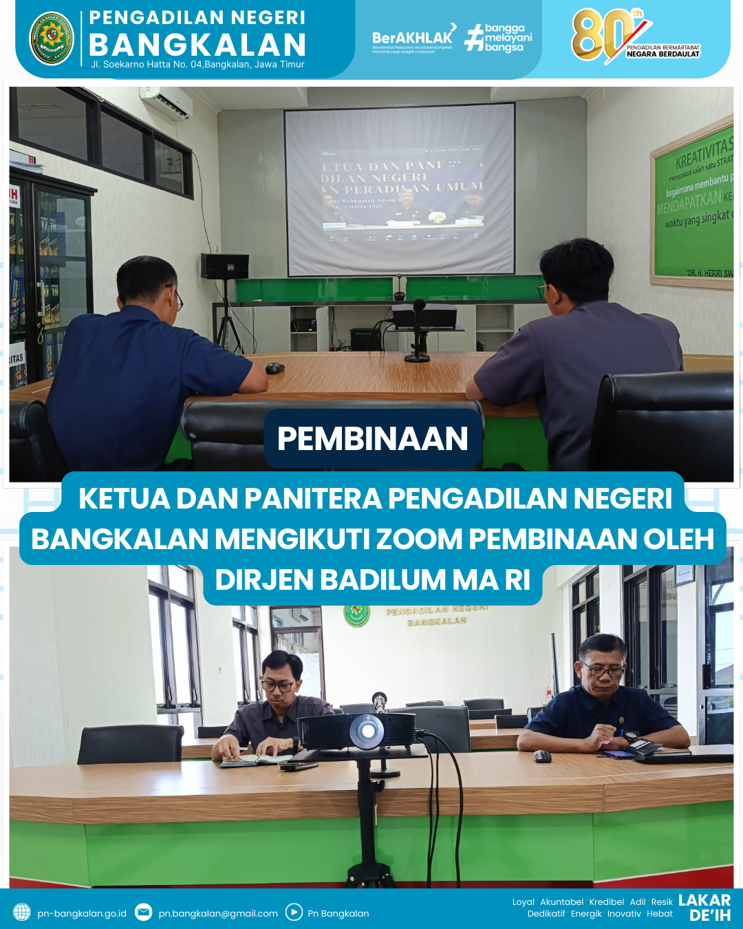 Selasa, 03 Maret 2026Ketua Pengadilan Negeri Bangkalan Bapak Arie Andika Adhikresna,S.H.,M.H., dan Panitera Pengadilan Negeri Bangkalan Bapak Agus Aryananda,S.H., mengikuti pembinaan secara daring oleh Direktur Jendral Peradilan Umum MA RI di ruang COC Pengadilan Negeri Bangkalan