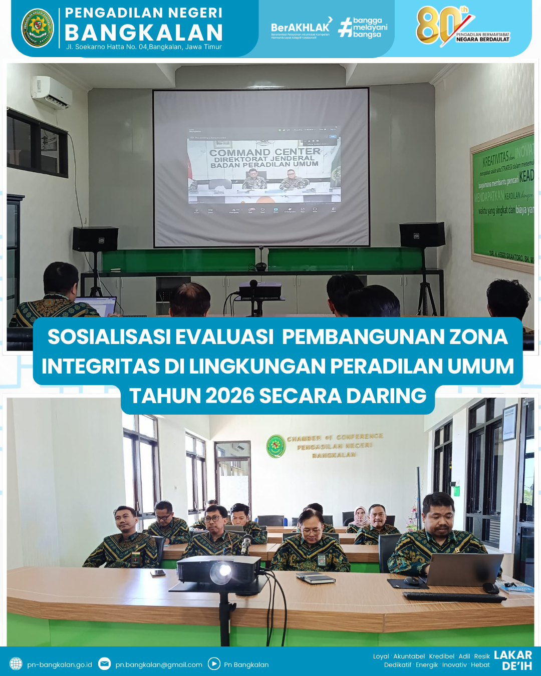 Kamis, 05 Maret 2026Bertempat di ruang COC Pengadilan Negeri Bangkalan, Ketua, Wakil Ketua serta Tim Pembangunan Zona Integritas Pengadilan Negeri Bangkalan mengikuti undangan sosialisasi evaluasi pembangunan zona integritas di lingkungan peradilan umum tahun 2026 secara daring yang di selenggarakan oleh Direktur Badan Peradilan Umum.