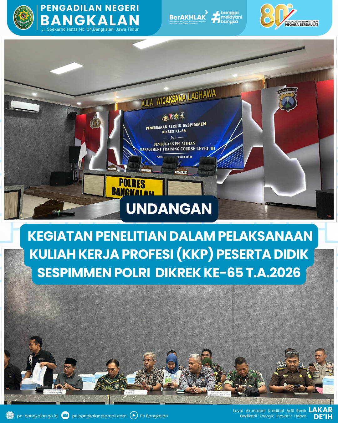 Bangkalan, 26 Februari 2026 bertempat di ruang Aula Wicaksana Laghawa Polres Bangkalan, Wakil Ketua Pengadilan Negeri Bangkalan Bapak D.Herjuna Wisnu Gautama,S.H.,M.Kn., menghadiri undangan Kegiatan Penelitian dalam Pelaksanaan Kuliah Kerja Profesi (KKP) Peserta Didik Sespimmen Polri Dikrek ke-65 Tahun Anggaran 2026.
