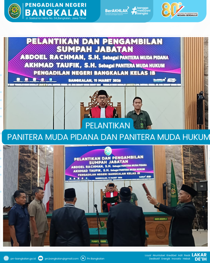 Selamat kepada pejabat yang telah dilantik. Semoga amanah dalam menjalankan tugas dan senantiasa memberikan pengabdian terbaik bagi institusi dan masyarakat. Pesan dari Ketua Pengadilan Negeri Bangkalan Bapak Arie Andhika Adikresna,SH.,MH.