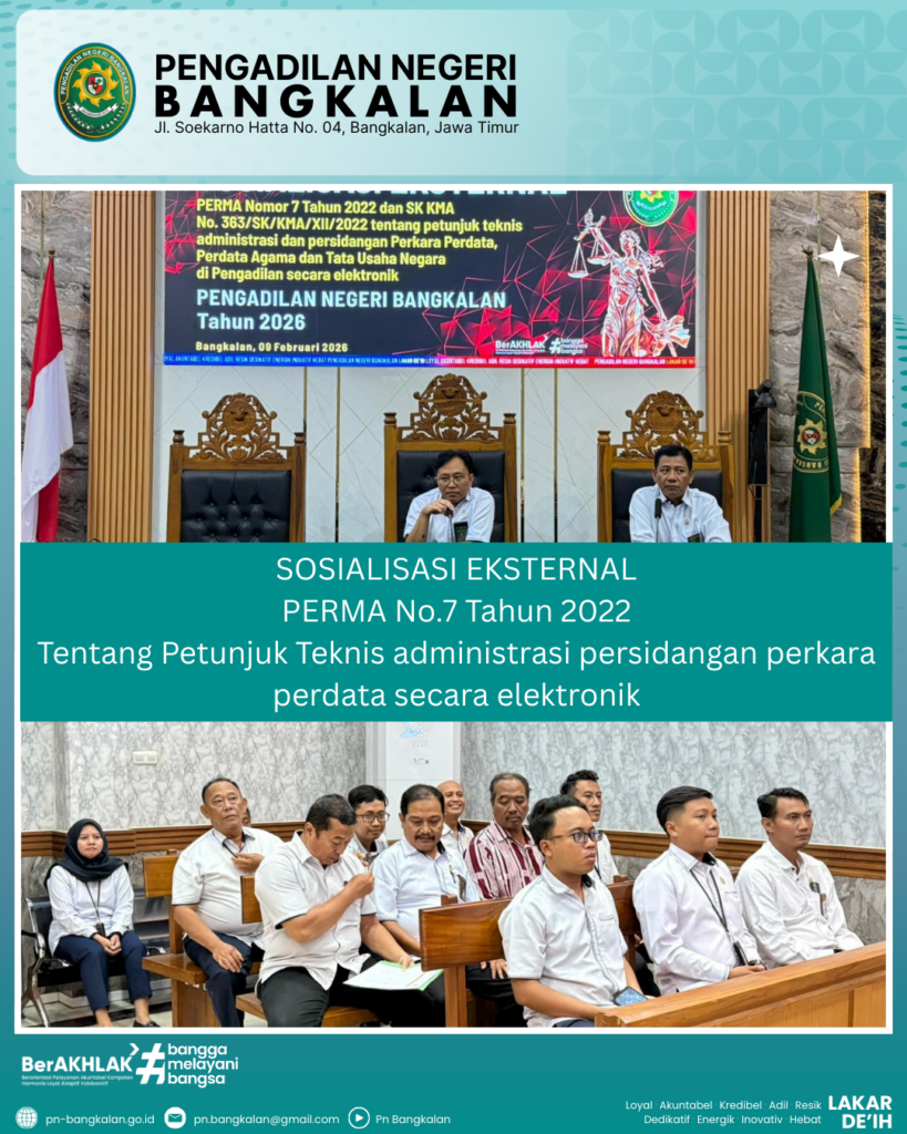 Senin, 09 Februari 2026 bertempat di Ruang sidang utama Pengadilan Negeri Bangkalan dilaksanakan Sosialisasi Ekternal Perma No. 6 Tahun 2022 Tentang Administrasi pengajuan upaya hukum dan persidangan kasasi dan peninjauan kembali di MARI secara elektronik dan Perma No.7 Tahun 2022 ( No.363/SK/KMA/XII/2022 tentang petunjuk teknis adminitrasi persidangan perkara perdata di pengadilan secara elektronik.