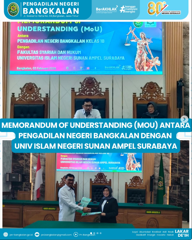Senin tanggal 02 Februari 2026 bertempat di Ruang Sidang Utama dilaksanakan memorandum of understanding (mou) antara pengadilan negeri bangkalan dengan