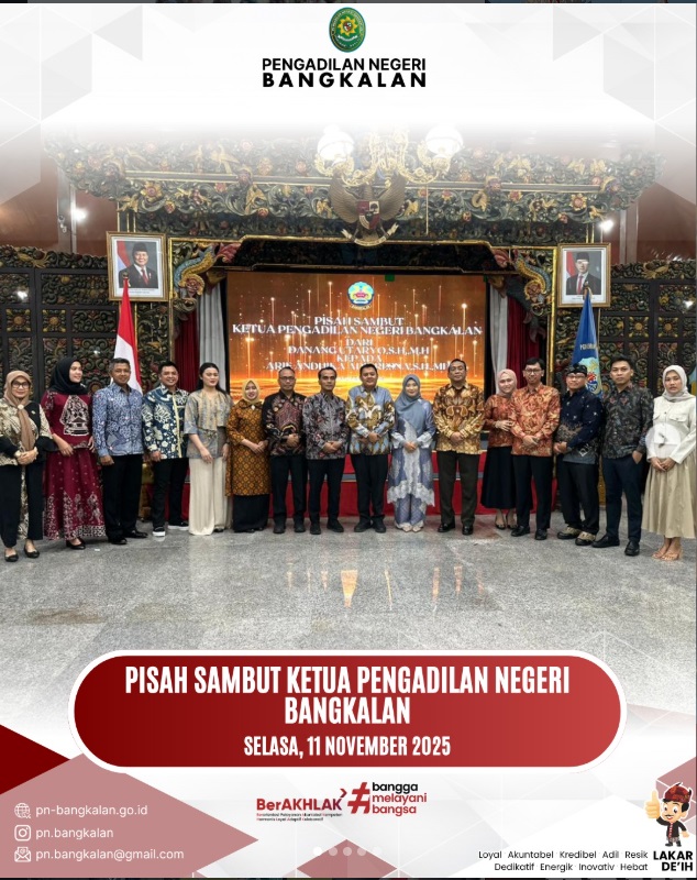 Bertempat di Pendopo Agung Bangkalan, berlangsung acara Pisah Sambut Ketua Pengadilan Negeri Bangkalan yang diselenggarakan oleh Pemerintah Kabupaten Bangkalan. Acara tersebut turut dihadiri oleh Bupati Bangkalan beserta seluruh unsur Forum Koordinasi Pimpinan Daerah (Forkopimda) Kabupaten Bangkalan, sebagai bentuk sinergi dan dukungan terhadap keberlanjutan kepemimpinan di lingkungan Pengadilan Negeri Bangkalan. Kegiatan ini menjadi momentum penting dalam melepas Bapak Danang Utaryo, S.H., M.H. yang telah menyelesaikan masa tugasnya, sekaligus menyambut Bapak Arie Andhika Adikresna, S.H., M.H. sebagai Ketua Pengadilan Negeri Bangkalan yang baru.